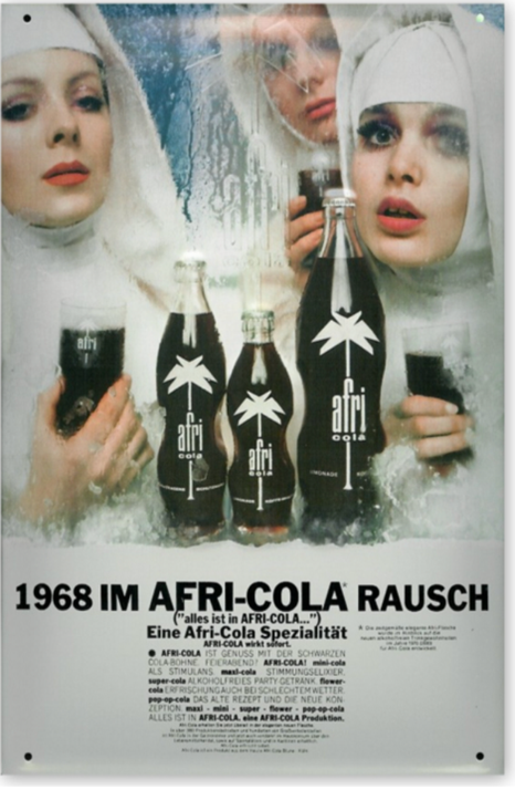 Den virkelige kulmination på Afri Colas kulturelle gennemslag kom dog i slutningen af 1960’erne, hvor kunstneren Charles Wilp skabte en af de mest banebrydende reklamekampagner i tysk historie. Med sloganet “sexy-mini-super-flower-pop-op-cola – alles ist in Afri Cola” gik reklamerne til kanten af, hvad samtidens samfund kunne rumme. Nonner i suggestive scener, psykedeliske billeduniverser og en kompromisløs visuel stil gjorde Afri Cola til mere end en drik – det blev et kunstværk og et kulturelt statement. Ikke overraskende vakte kampagnen protester fra den katolske kirke, men samtidig sikrede den brandet en ikonisk status, der stadig står som et referencepunkt i europæisk reklamehistorie.